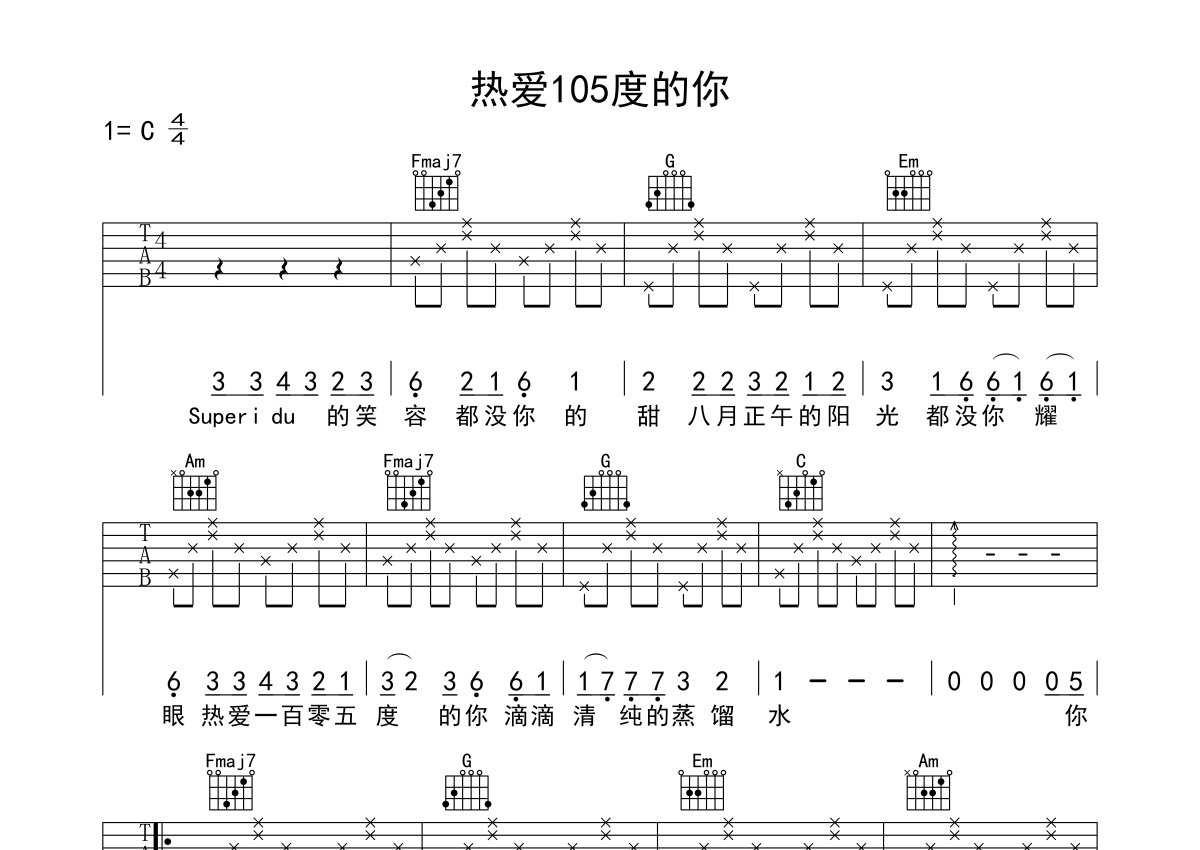 《热爱105°的你》是阿肆演唱的一首歌曲,本吉他谱采用的是C调指法编配,这份吉他谱共有三张高清图谱,图谱由 @mono 编配上传,图谱使用六线谱编配,包含吉他和弦指法、简谱以及歌词部分,使用这份热爱105°的你吉他谱,可以让你更加方便地掌握这首歌曲的弹唱技巧,快来尝试吧。阿肆《热爱105°的你》吉他弹唱谱,采用C调指法编配,郑韩金手指吉他教育新郑分部编配出品,共有3张高清图谱。