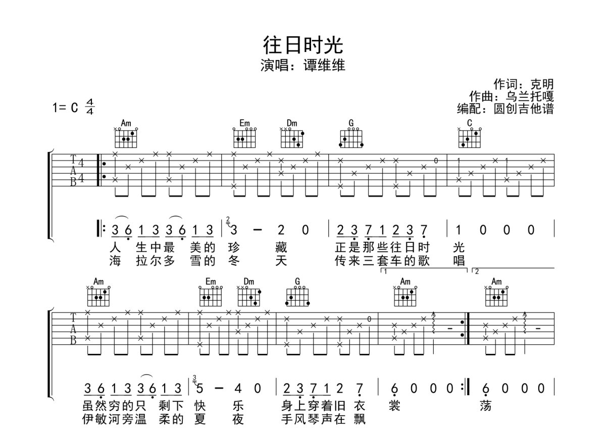 谭维维《往日时光》吉他谱 - C调弹唱六线谱