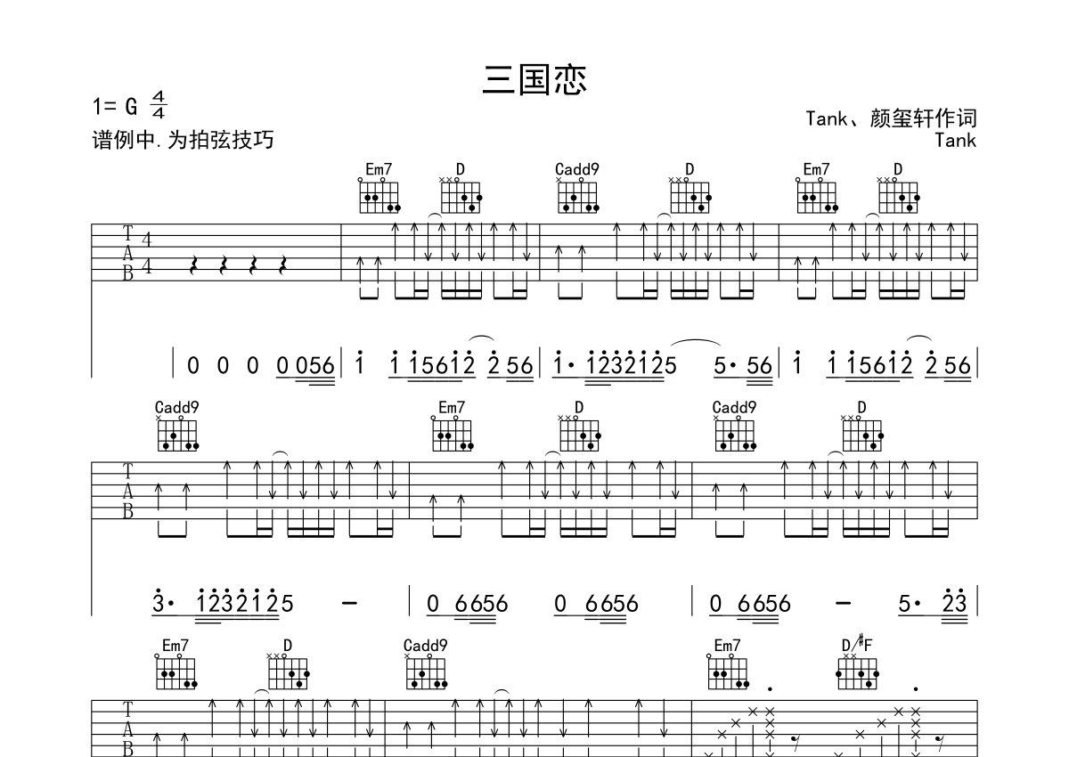 tank《三国恋》吉他谱 - G调弹唱六线谱 - G调版