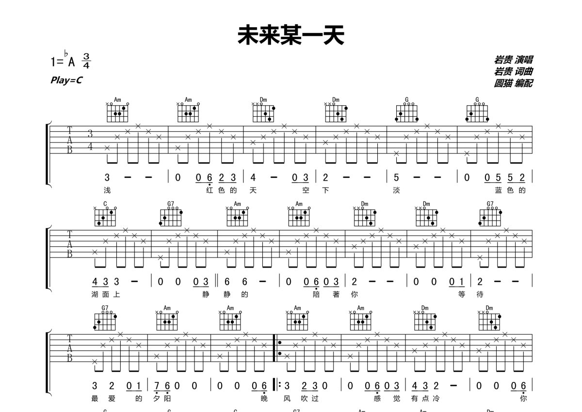 岩贵《未来某一天》吉他谱 - C调弹唱六线谱 - 原版