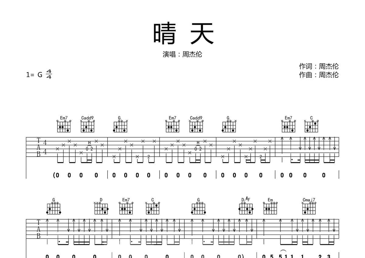 周杰伦《晴天》吉他谱 - G调弹唱六线谱