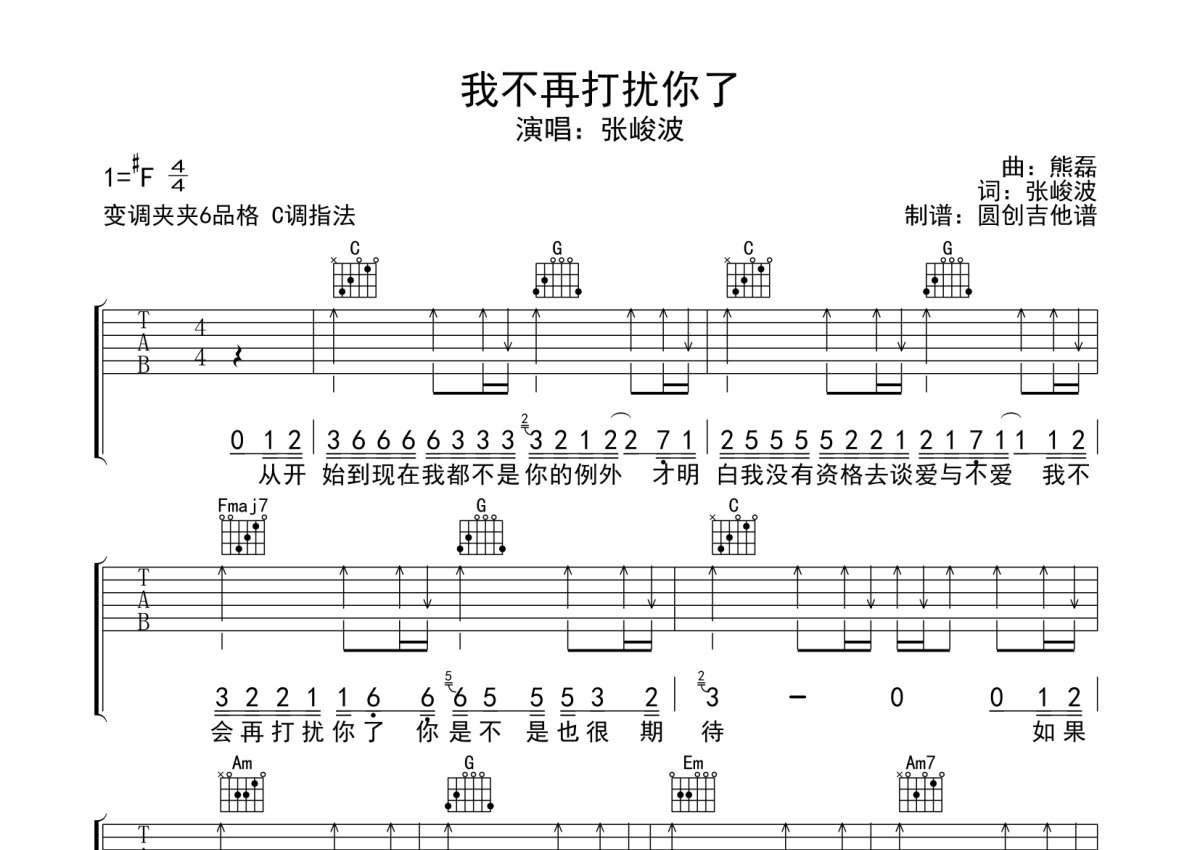 张俊波《我不再打扰你了》吉他谱 - C调弹唱六线谱