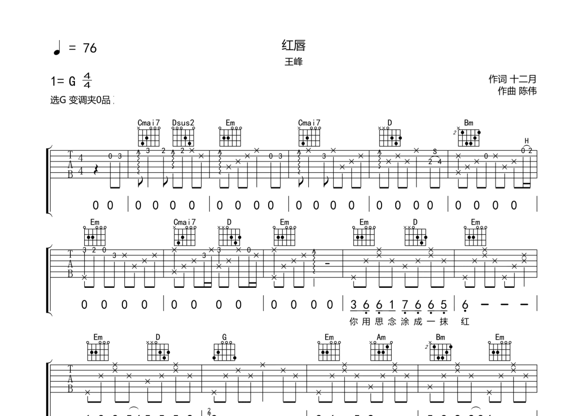 安静/王峰《红唇》吉他谱 - G调弹唱六线谱