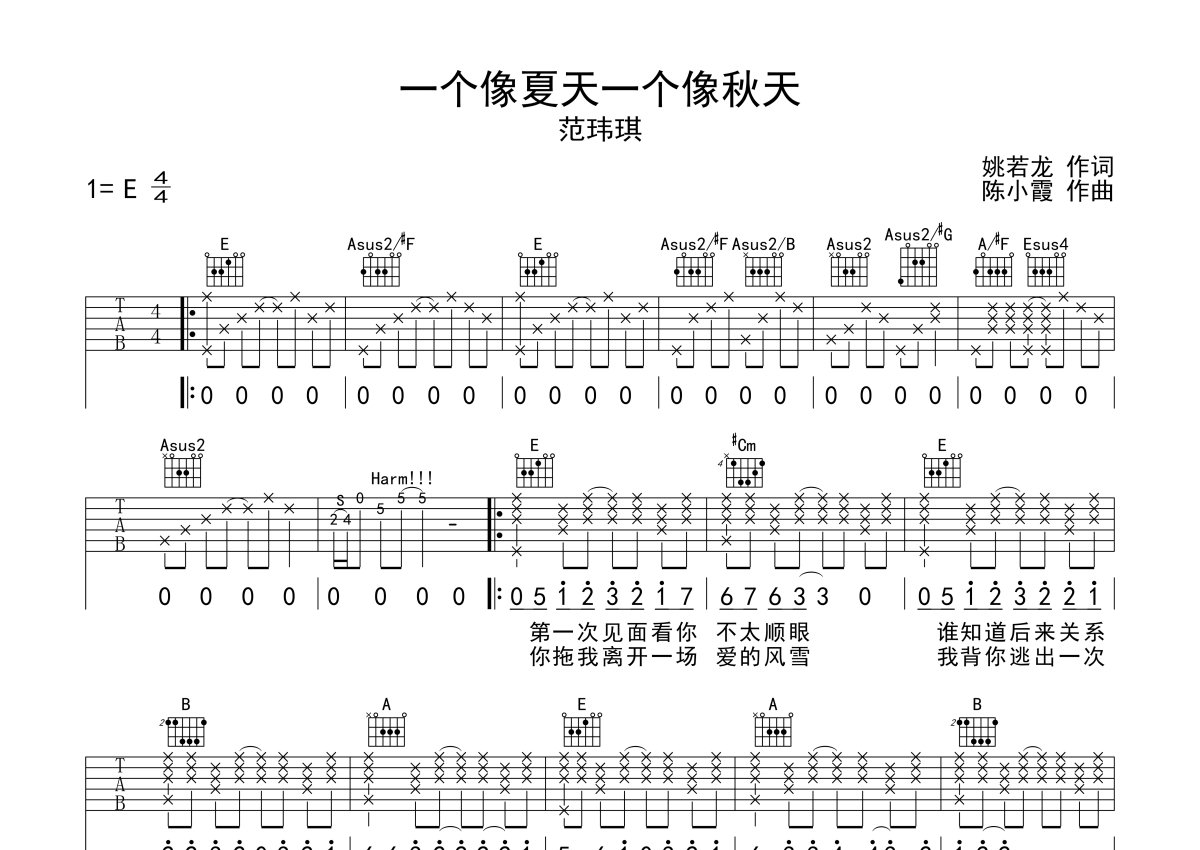《一个像夏天一个像秋天》是范玮琪演唱的一首歌曲,本吉他谱采用的是E调指法编配,这份吉他谱共有两张高清图谱,图谱由 @玉帝哥哥 编配上传,图谱使用六线谱编配,包含吉他和弦指法、简谱以及歌词部分,使用这份一个像夏天一个像秋天吉他谱,可以让你更加方便地掌握这首歌曲的弹唱技巧,快来尝试吧。范玮琪《一个像夏天一个像秋天》吉他谱,E调指法,高清弹唱谱,一个像夏天一个像秋天六线谱,音艺吉他出品这首歌曲由姚若龙和陈小霞合作创作,从陌生到熟悉再到成为最好的朋友,歌词根据范玮琪与徐熙娣的友情而谱写。友情有时比爱情更重要。友情对于大多数人来说,比爱情更忠诚。