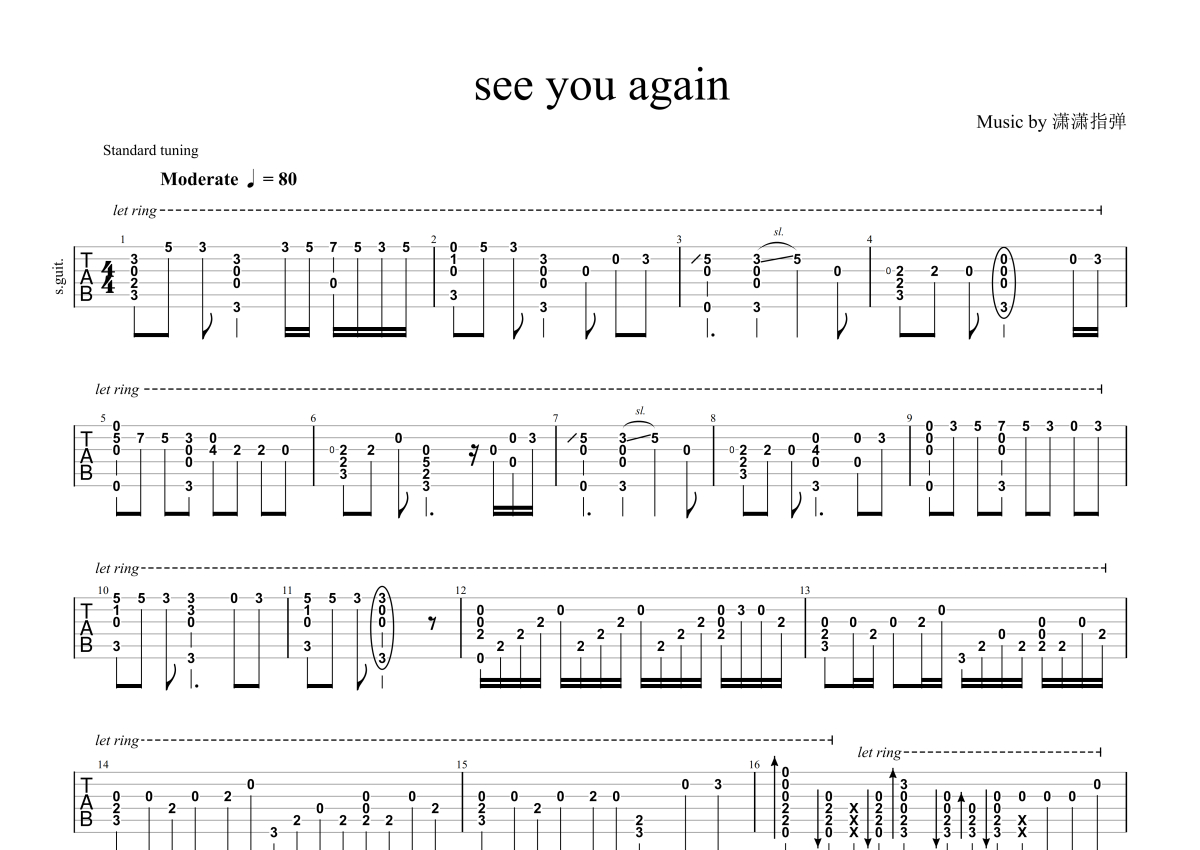 《see you again》,速度与激情插曲,这份吉他谱共有两张高清图谱,图谱由 @玉帝哥哥 编配上传,图谱使用六线谱编配,曲谱配备了相关的音频提供试听,使用这份see you again吉他谱,可以让你更加方便地掌握这首歌曲的演奏技巧,快来尝试吧。《see you again》吉他谱_吉他独奏谱_速度与激情插曲。