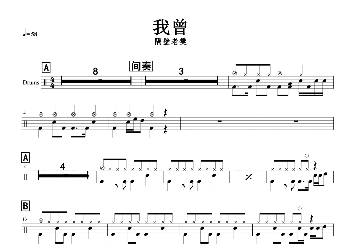 隔壁老樊《我曾》鼓谱 - 架子鼓谱