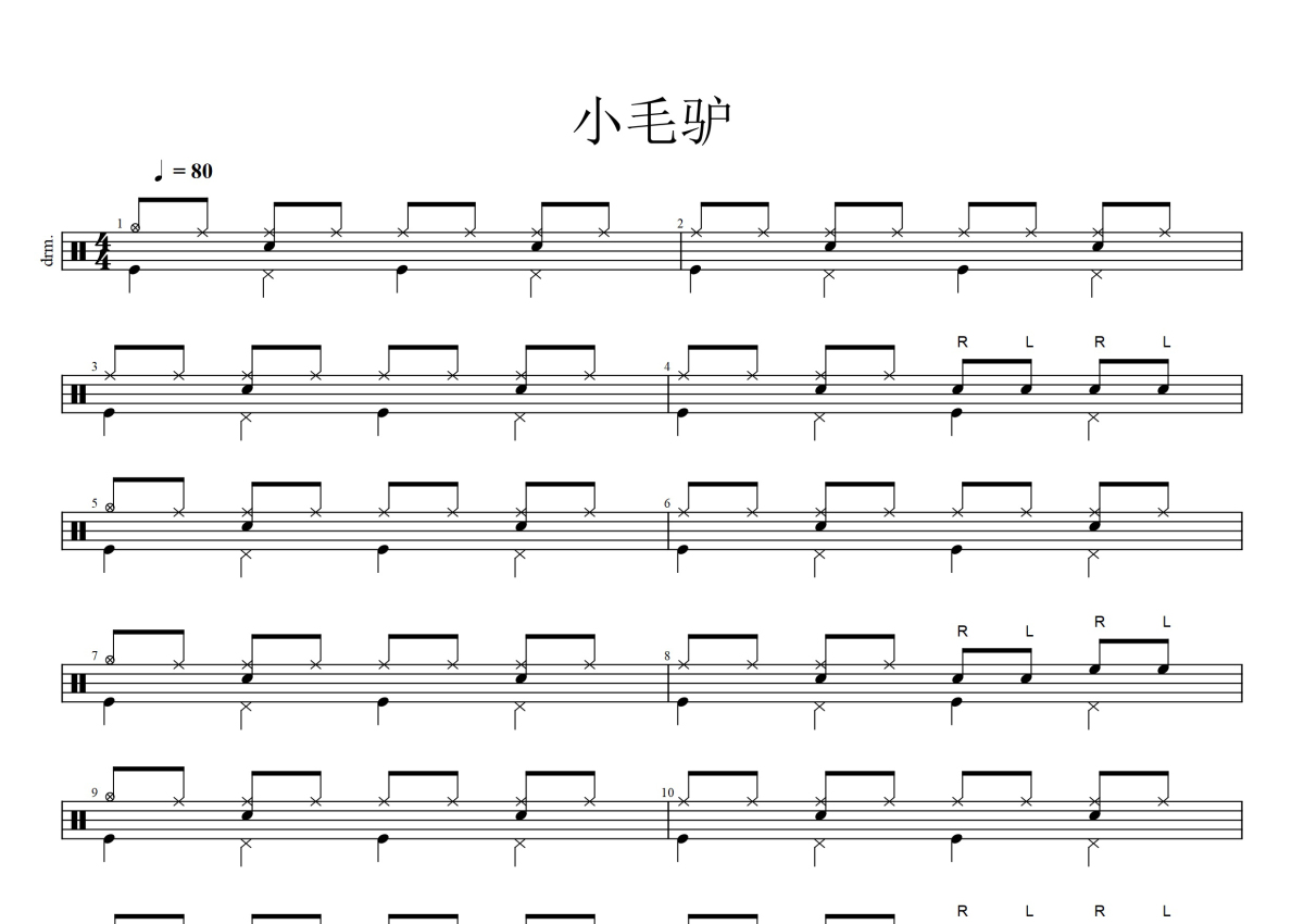 《小毛驴》,这份鼓谱共有一张高清图谱,图谱由 @玉帝哥哥 编配上传,图谱使用五线谱编配,使用这份小毛驴架子鼓谱,你将能够轻松地敲打出这首小毛驴,快来尝试吧。儿童架子鼓小毛驴架子鼓鼓谱 简单入门曲 附鼓谱示范曲,4/4拍节奏,每分钟80拍。