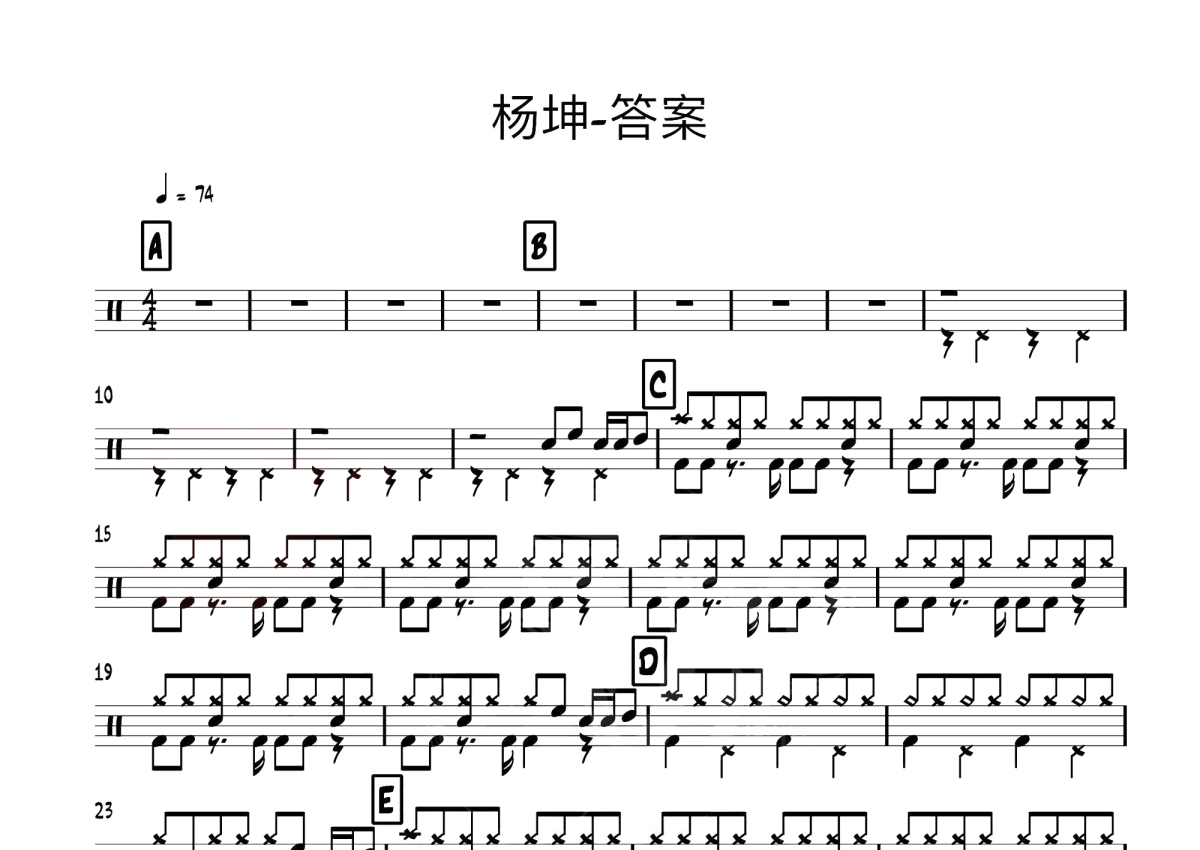 《答案》是杨坤演唱的一首歌曲,这份鼓谱共有两张高清图谱,图谱由 @玉帝哥哥 编配上传,图谱使用五线谱编配,使用这份答案架子鼓谱,你将能够轻松地敲打出这首杨坤的答案,快来尝试吧。抖音热曲《答案》架子鼓谱爵士鼓,是由杨坤与郭采洁演唱的一首歌曲,作词:梁芒、作曲:杨坤,4/4拍节奏,速度每分钟74拍。