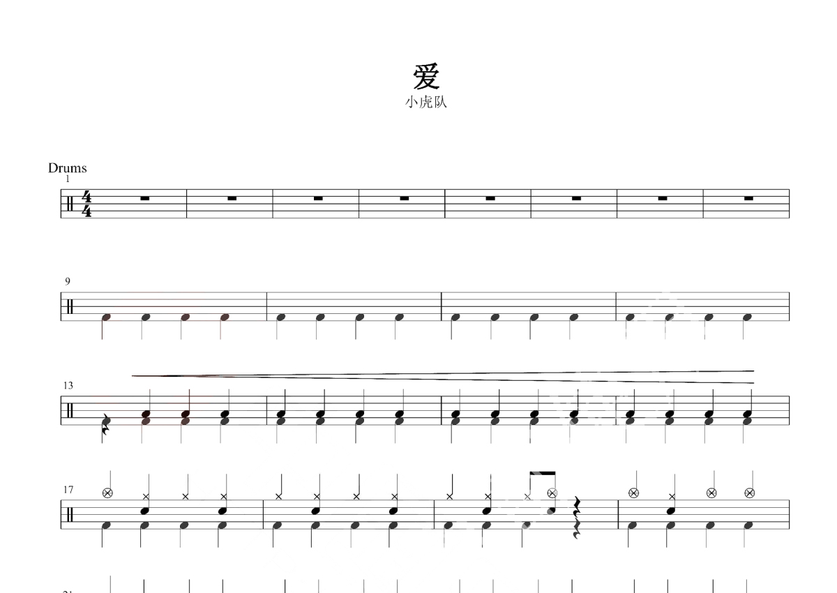 《爱》是小虎队演唱的一首歌曲,这份鼓谱共有四张高清图谱,图谱由 @玉帝哥哥 编配上传,图谱使用五线谱编配,使用这份爱架子鼓谱,你将能够轻松地敲打出这首小虎队的爱,快来尝试吧。《爱》架子鼓谱爵士鼓 4/4拍节奏,是由小虎队组合演唱的一首歌曲,作词:陈大力,李子恒 作曲:陈大力,是为了配合关心聋哑人公益活动而创作,获得1991年台湾“金曲奖龙虎榜”秋季总排行冠军。