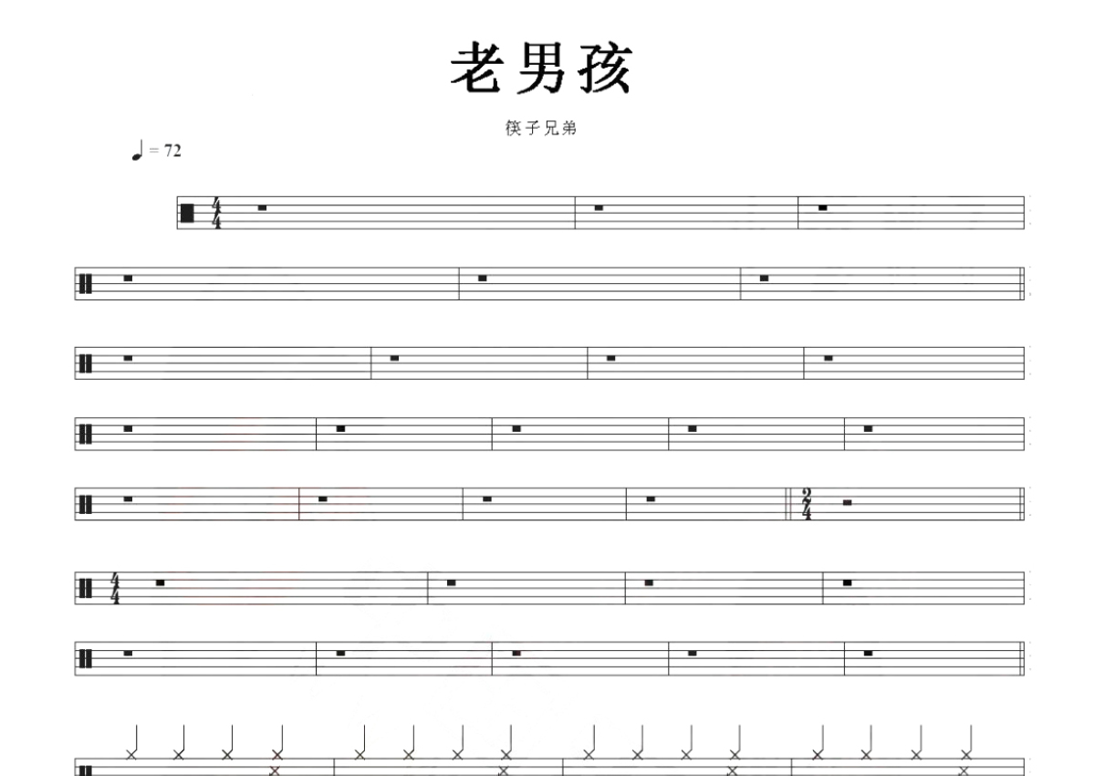 《老男孩》是筷子兄弟演唱的一首歌曲,这份鼓谱共有两张高清图谱,图谱由 @玉帝哥哥 编配上传,图谱使用五线谱编配,使用这份老男孩架子鼓谱,你将能够轻松地敲打出这首筷子兄弟的老男孩,快来尝试吧。老男孩鼓谱是由筷子兄弟演唱的一首歌曲,这首歌曲是根据大桥卓弥《ありがとう(谢谢)》改编的,歌曲发行于2011年11月20日,收录在专辑《父亲》中,作曲:大桥卓弥、作词:筷子兄弟,每分钟72拍。