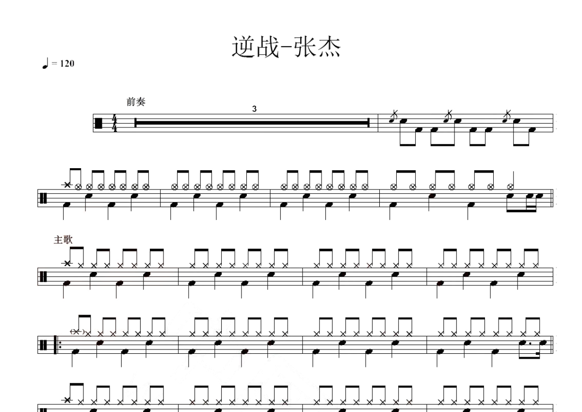 《逆战》是张杰演唱的一首歌曲,这份鼓谱共有两张高清图谱,图谱由 @玉帝哥哥 编配上传,图谱使用五线谱编配,使用这份逆战架子鼓谱,你将能够轻松地敲打出这首张杰的逆战,快来尝试吧。“逆战“鼓谱是由张杰演唱的一首歌,作词:裴育,作曲:曲世聪,宋涛,是腾讯游戏枪战网游“逆战”演唱的歌曲, 每分钟120拍。