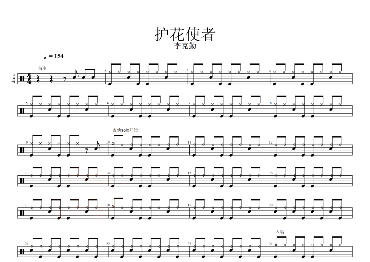 《护花使者》是李克勤演唱的一首歌曲,这份鼓谱共有三张高清图谱,图谱由 @玉帝哥哥 编配上传,图谱使用五线谱编配,使用这份护花使者架子鼓谱,你将能够轻松地敲打出这首李克勤的护花使者,快来尝试吧。李克勤”护花使者“架子鼓爵士鼓谱是由香港艺人李克勤所演唱的一首粤语歌曲,作曲:长谷川集平 作曲:苏德华,每分钟153拍。