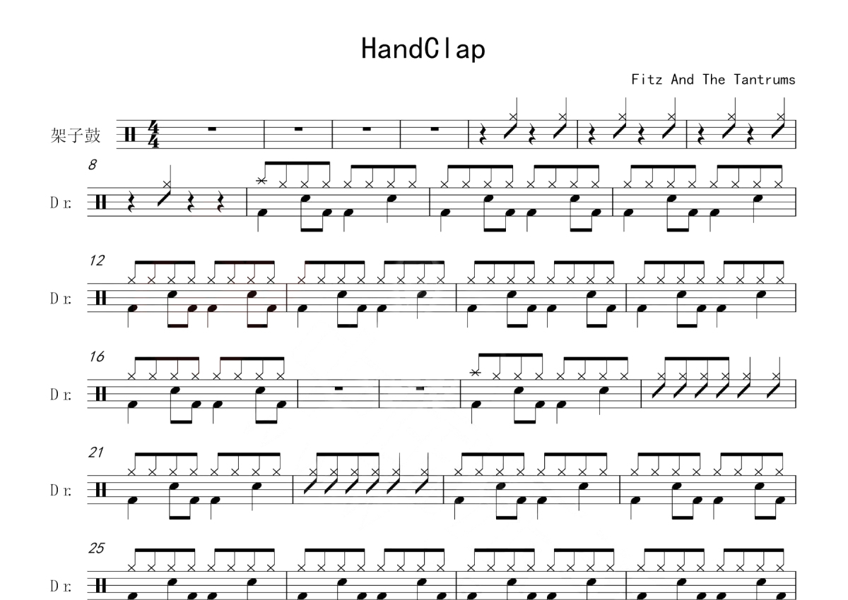 《HandClap》是Fitz and The Tantrums演唱的一首歌曲,这份鼓谱共有两张高清图谱,图谱由 @玉帝哥哥 编配上传,图谱使用五线谱编配,使用这份HandClap架子鼓谱,你将能够轻松地敲打出这首Fitz and The Tantrums的HandClap,快来尝试吧。HandClap是由Fitz and The Tantrums演唱的一首歌曲,作词:Jeremy Ruzumna,James KingEric,Frederic 作曲:Jeremy Ruzumna,James KingEric,Frederic。