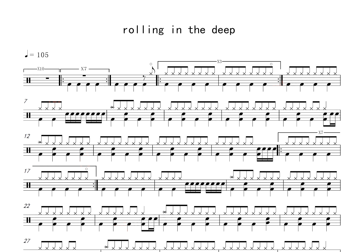 《Rolling in the Deep》是adele阿黛尔·阿德金斯演唱的一首歌曲,这份鼓谱共有一张高清图谱,图谱由 @玉帝哥哥 编配上传,图谱使用五线谱编配,使用这份Rolling in the Deep架子鼓谱,你将能够轻松地敲打出这首adele阿黛尔·阿德金斯的Rolling in the Deep,快来尝试吧。《Rolling in the Deep》是由英国女歌手阿黛尔·阿德金斯演唱的一首流行灵魂歌曲,歌词、简谱由阿黛尔·阿德金斯和保罗·伊普沃斯合作编写,音乐制作由保罗·艾普沃斯负责。