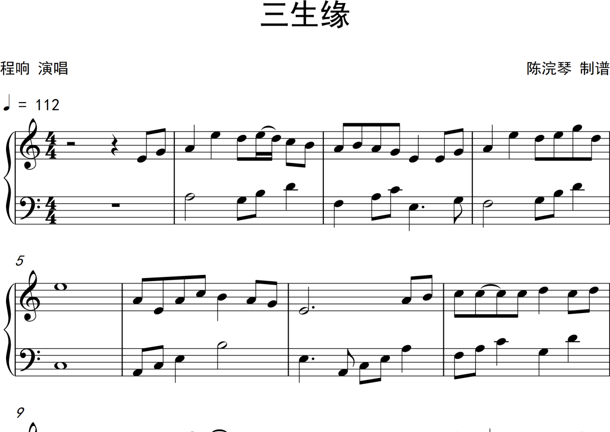 《三生缘》是程响演唱的一首歌曲,这份钢琴谱共有两张高清图谱,图谱由 @月隐云先知 编配上传,曲谱配备了相关的音频提供试听,使用这份三生缘钢琴谱,可以让你更加方便地掌握这首歌曲的演奏技巧,快来尝试吧。程响《三生缘》钢琴谱。