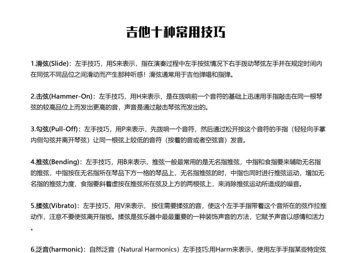 《吉他常用十种技巧》,这份吉他教程谱共有一张高清图谱,图谱由 @玉帝哥哥 编配上传打谱啦吉他基础教程_吉他常用十种技巧。