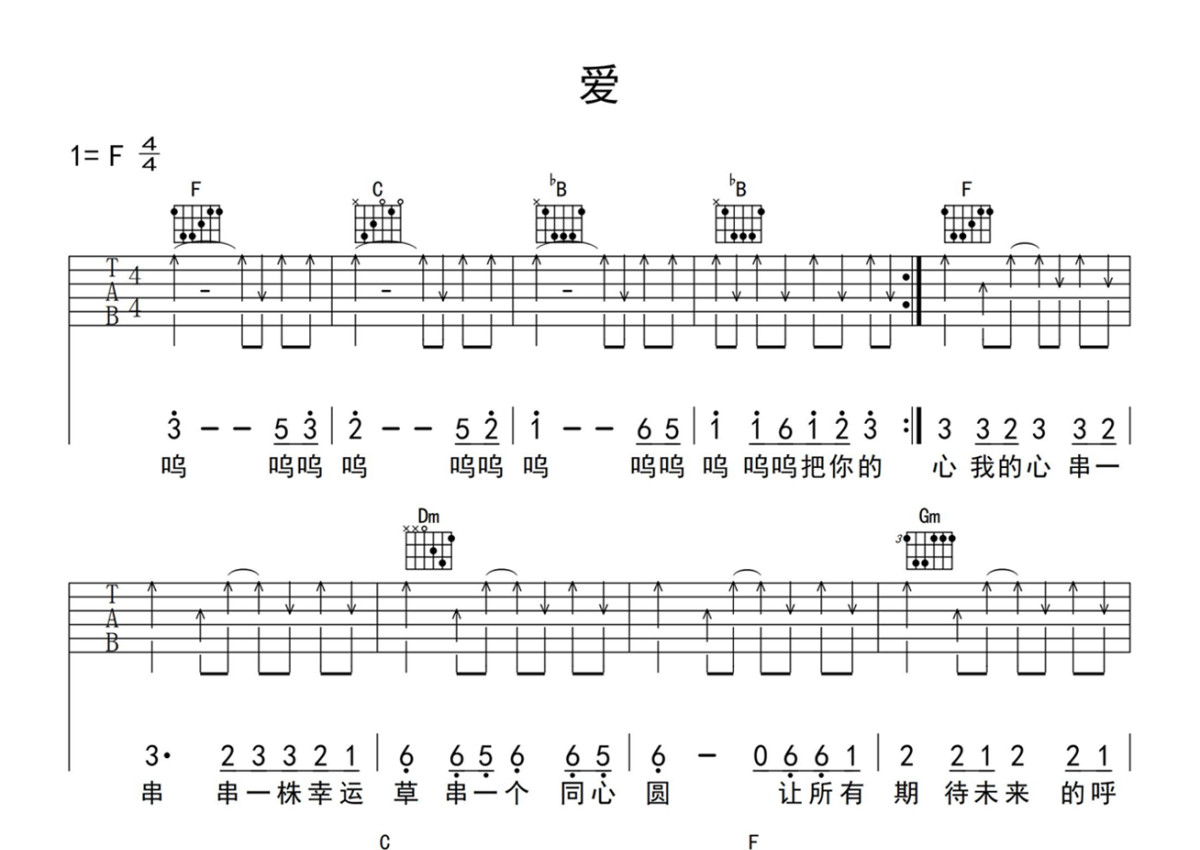 《爱》是小虎队演唱的一首歌曲,本吉他谱采用的是F调指法编配,这份吉他谱共有两张高清图谱,图谱由 @玉帝哥哥 编配上传,图谱使用六线谱编配,包含吉他和弦指法、简谱以及歌词部分,使用这份爱吉他谱,可以让你更加方便地掌握这首歌曲的弹唱技巧,快来尝试吧。小虎队《爱》吉他谱_F调吉他弹唱谱。