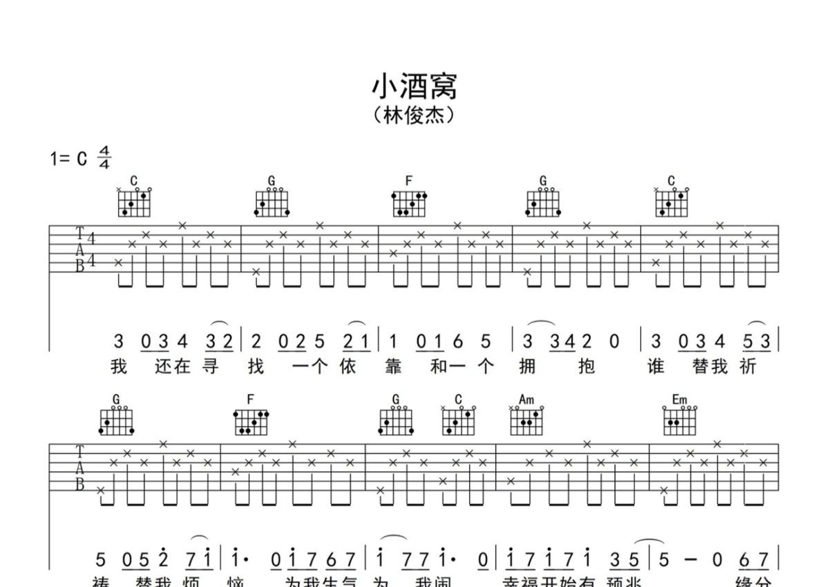 林俊杰《小酒窝》吉他谱 - C调弹唱六线谱