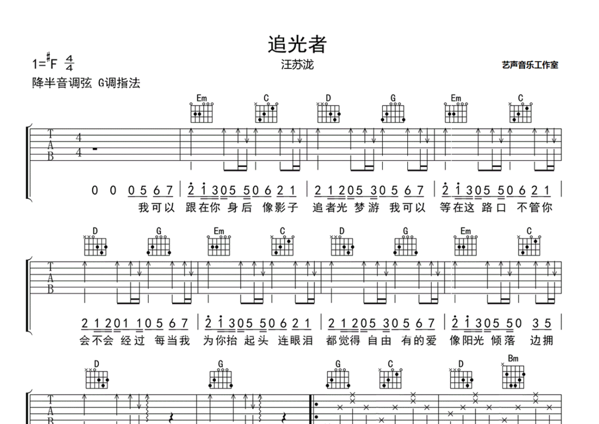 汪苏泷《追光者》吉他谱 - G调弹唱六线谱