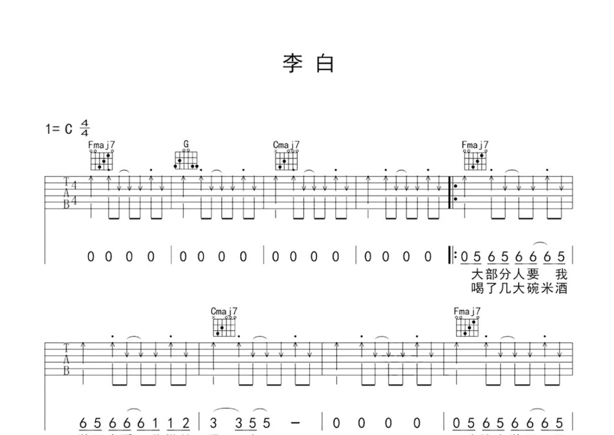 李荣浩《李白》吉他谱 - C调弹唱六线谱