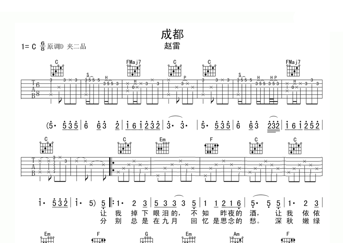 赵雷《成都》吉他谱 - C调弹唱六线谱