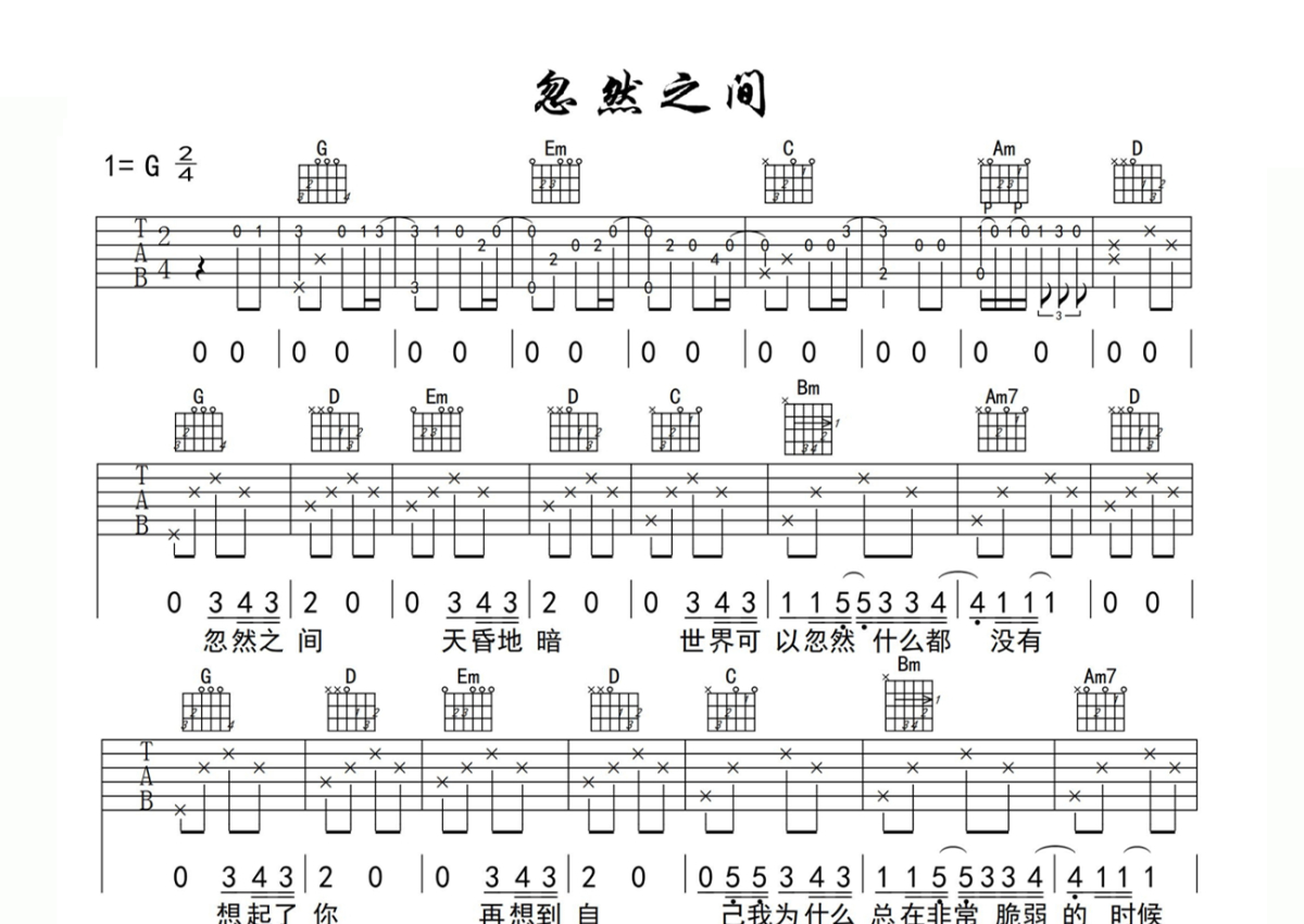 《忽然之间》是莫文蔚演唱的一首歌曲,本吉他谱采用的是G调指法编配,这份吉他谱共有一张高清图谱,图谱由 @玉帝哥哥 编配上传,图谱使用六线谱编配,包含吉他和弦指法、简谱以及歌词部分,使用这份忽然之间吉他谱,可以让你更加方便地掌握这首歌曲的弹唱技巧,快来尝试吧。莫文蔚《忽然之间》吉他谱_G调吉他弹唱谱。