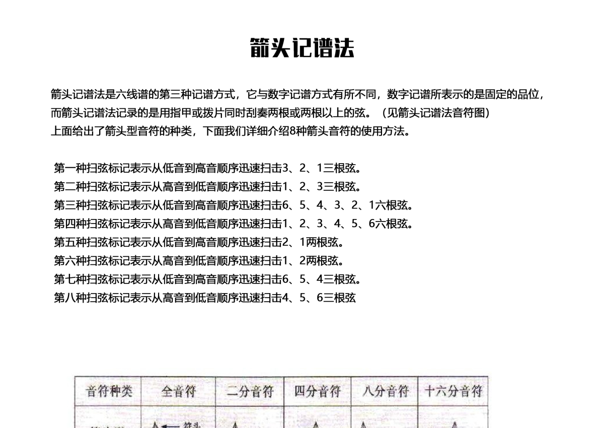 箭头记谱法是六线谱的第三种记谱方式,它与数字记谱方式有所不同,数字记谱所表示的是固定的品位,而箭头记谱法记录的是用指甲或拨片同时刮奏两根或两根以上的弦。(见箭头记谱法音符图)