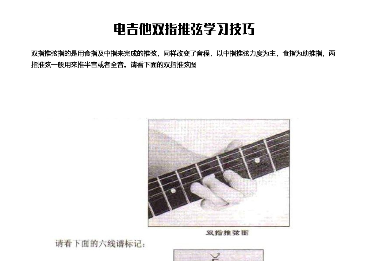 《双指推弦学习技巧》,这份吉他教程谱共有一张高清图谱,图谱由 @玉帝哥哥 编配上传 双指推弦—电吉他技巧 > 双指推弦指的是用食指及中指来完成的推弦,同样改变了音程,以中指推弦力度为主,食指为助推指,两指推弦一般用来推半音或者全音。请看下面的双指推弦图: > > 。