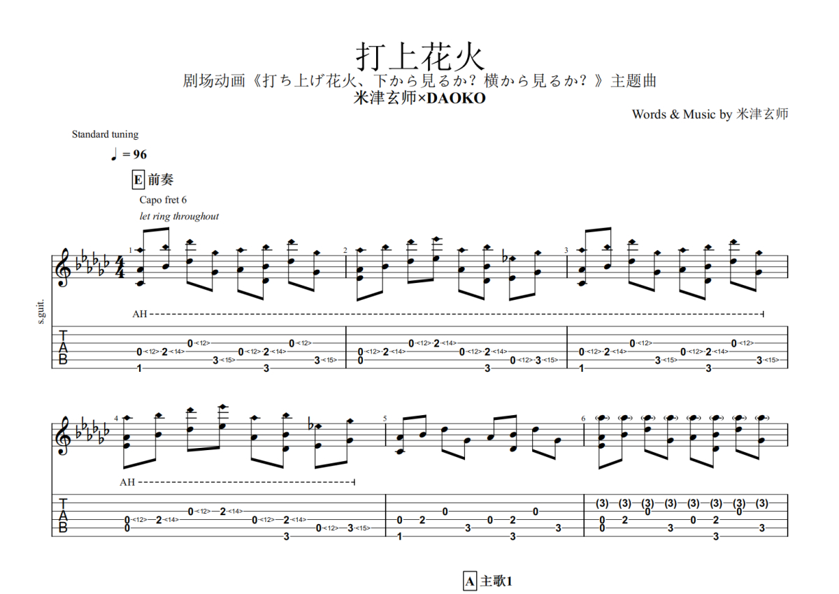米津玄师/DAOKO《打上花火》吉他谱 - 独奏六线谱 - 带五线谱