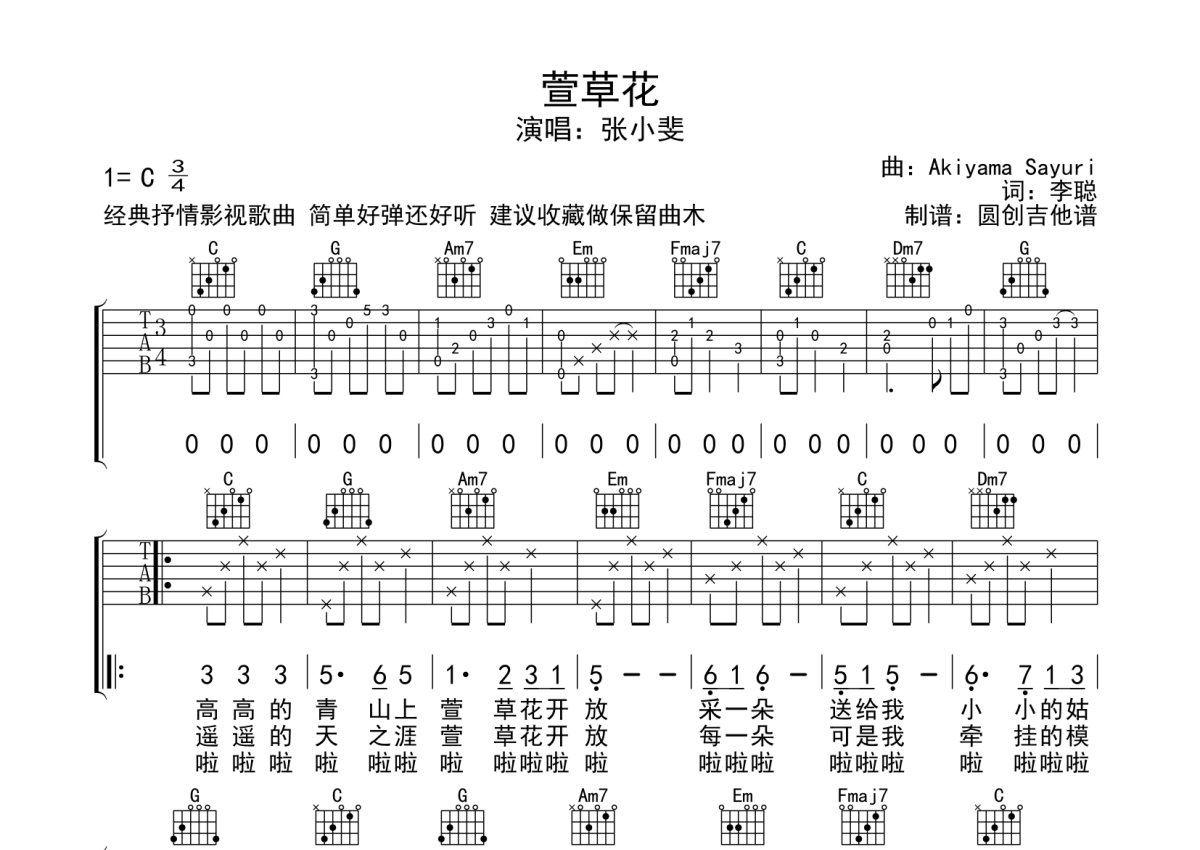 张小斐《萱草花》吉他谱 - C调弹唱六线谱
