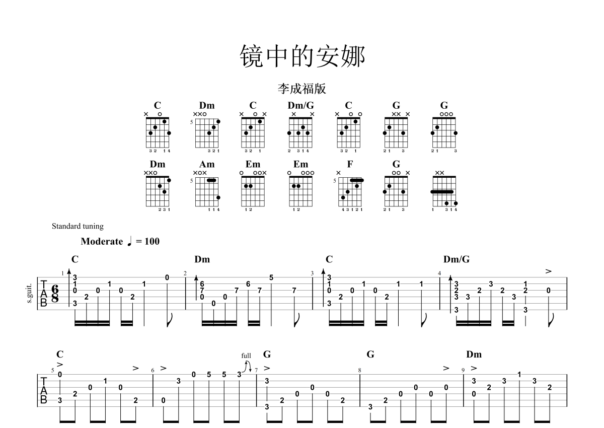《镜中的安娜》,李成福版本,这份吉他谱共有两张高清图谱,图谱由 @玉帝哥哥 编配上传,图谱使用六线谱编配,曲谱配备了相关的音频提供试听,使用这份镜中的安娜吉他谱,可以让你更加方便地掌握这首歌曲的演奏技巧,快来尝试吧。《镜中的安娜》吉他谱_吉他独奏谱_李成福版本。