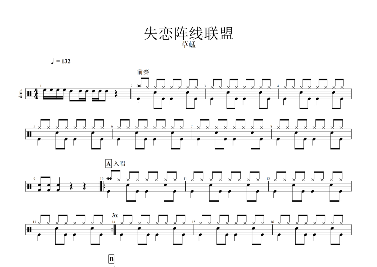 《失恋阵线联盟》是草蜢乐队演唱的一首歌曲,这份鼓谱共有两张高清图谱,图谱由 @玉帝哥哥 编配上传,图谱使用五线谱编配,使用这份失恋阵线联盟架子鼓谱,你将能够轻松地敲打出这首草蜢乐队的失恋阵线联盟,快来尝试吧。失恋阵线联盟由宝丽金唱片公司1990年10月01日出品的唱片专辑。歌曲由“草蜢”蔡一智,蔡一杰和苏志威三个大男孩演唱。电视剧《家有仙妻》主题曲,当年火爆一时,粤语版歌名为《失恋》。2015年被电影《我的少女时代》作为片尾曲。
