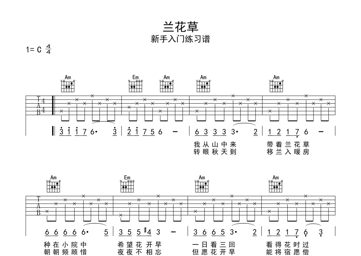 《兰花草》吉他谱 - C调弹唱六线谱 - 吉他入门练习谱