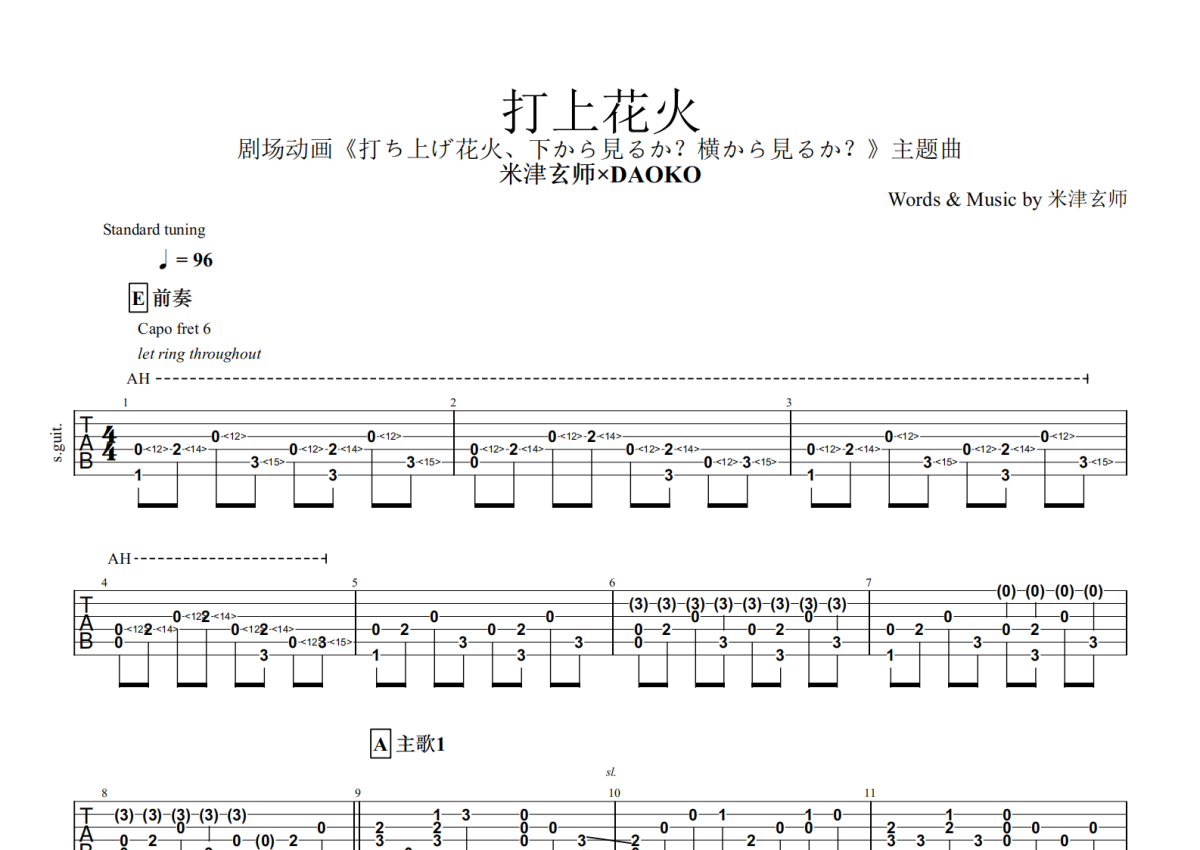 米津玄师/DAOKO《打上花火》吉他谱 - 独奏六线谱