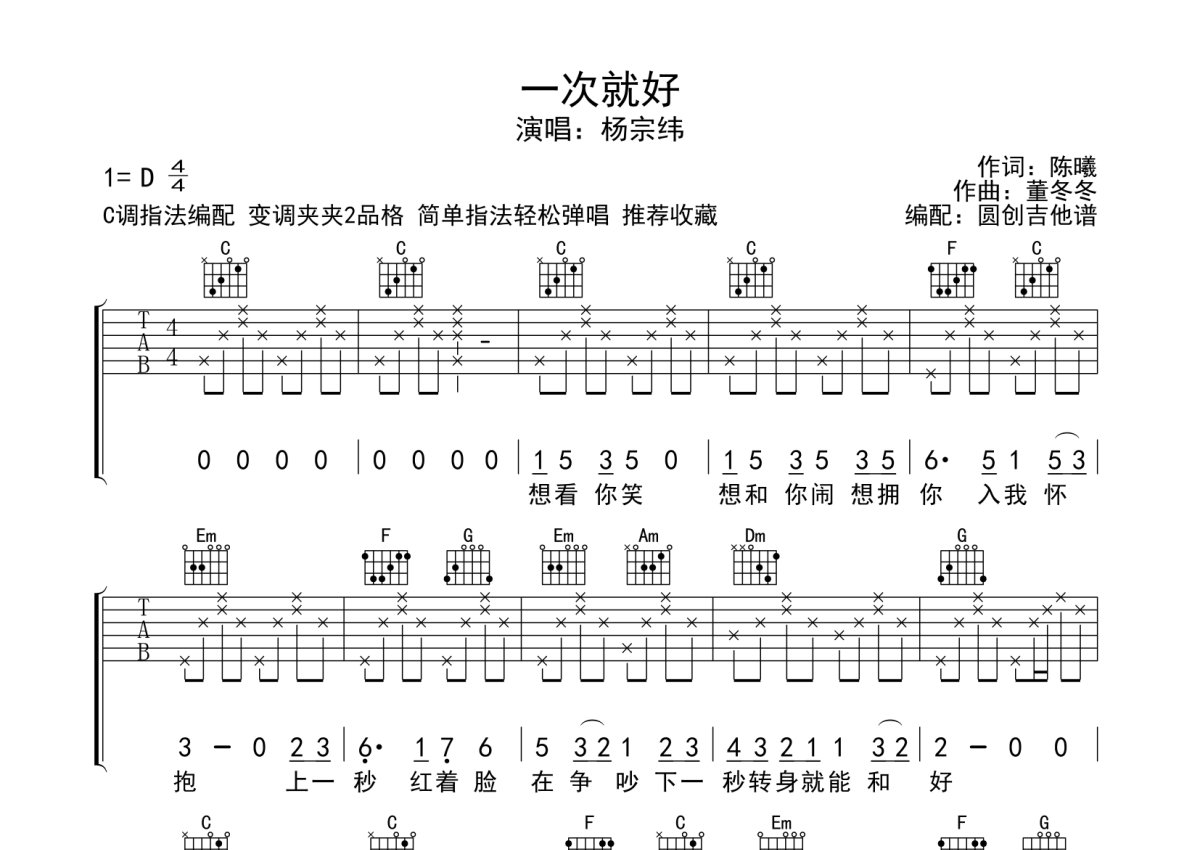 杨宗纬《一次就好》吉他谱 - C调弹唱六线谱