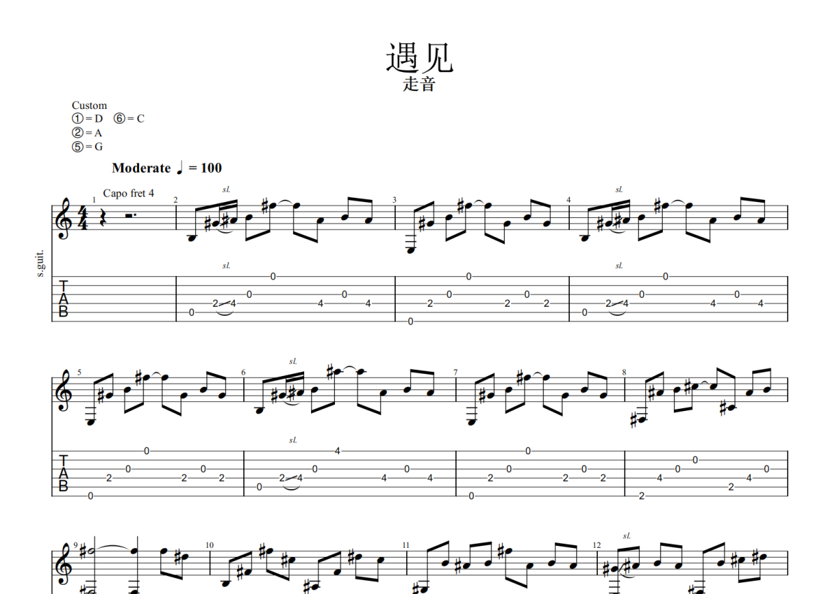 孙燕姿《遇见》吉他谱 - 独奏六线谱 - 走音 带五线谱版本
