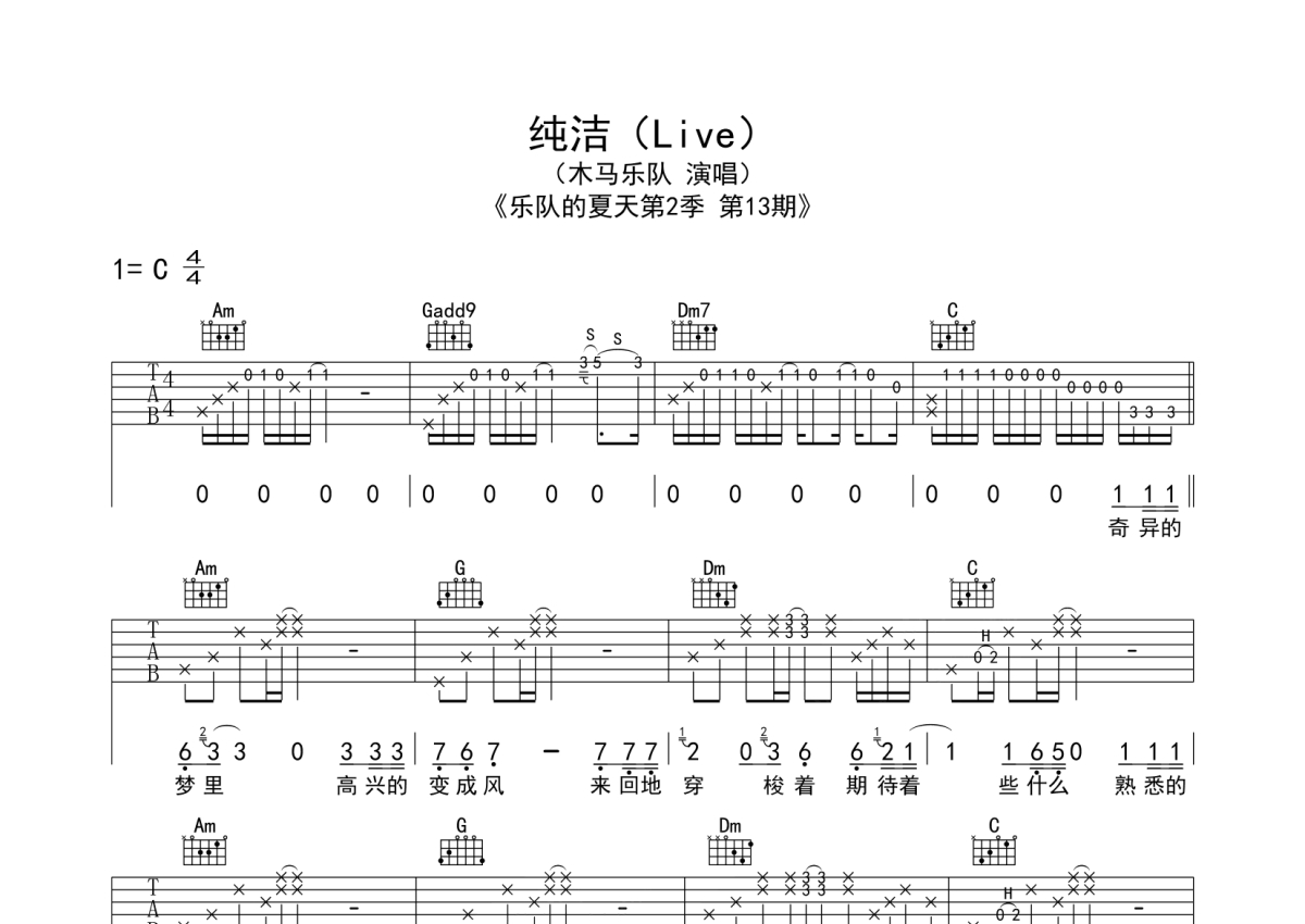 木马乐队《纯洁》吉他谱 - C调弹唱六线谱 - 现场版