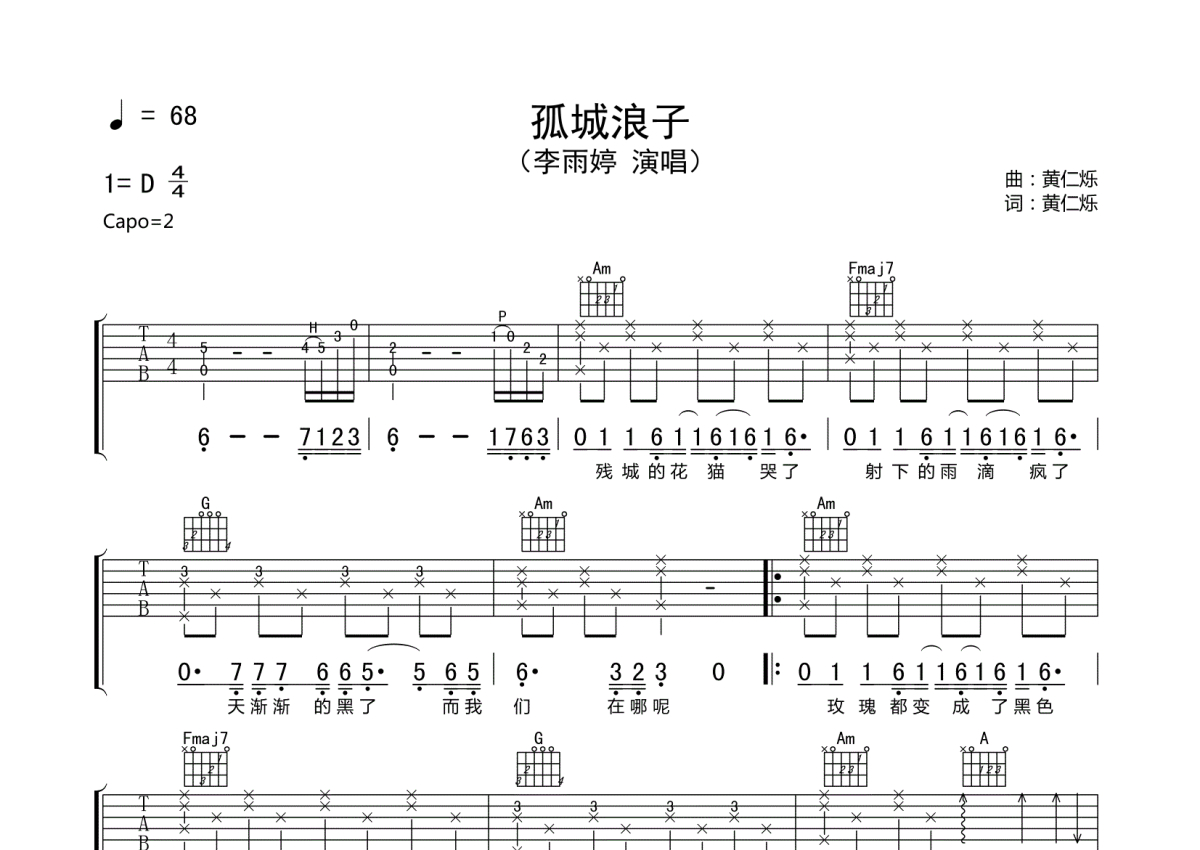 李雨婷《孤城浪子》吉他谱 - C调弹唱六线谱