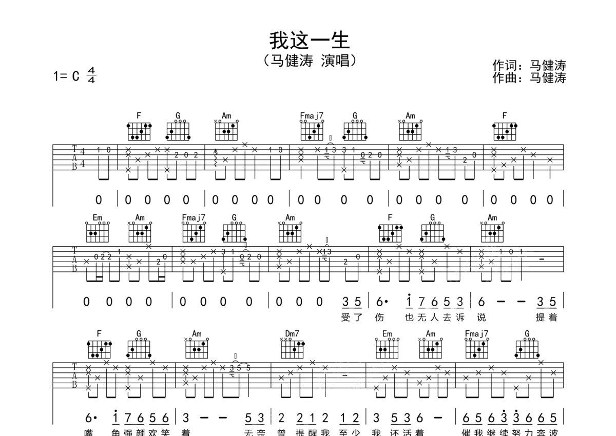 马健涛《我这一生》吉他谱 - C调弹唱六线谱