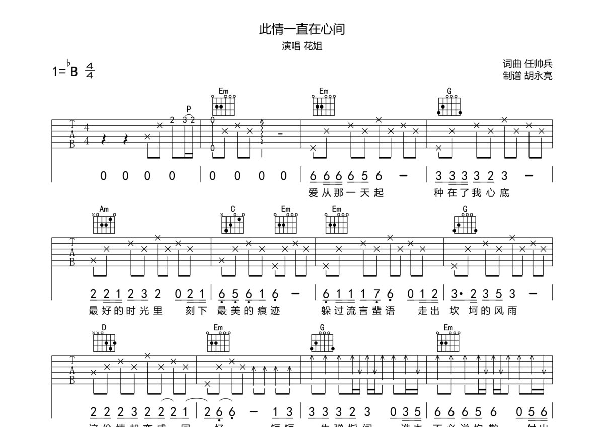 《此情在心间》是花姐演唱的一首歌曲,本吉他谱采用的是G调指法编配,这份吉他谱共有一张高清图谱,图谱由 @玉帝哥哥 编配上传,图谱使用六线谱编配,包含吉他和弦指法、简谱以及歌词部分,使用这份此情在心间吉他谱,可以让你更加方便地掌握这首歌曲的弹唱技巧,快来尝试吧。花姐《此情在心间》吉他谱_G调吉他弹唱谱。