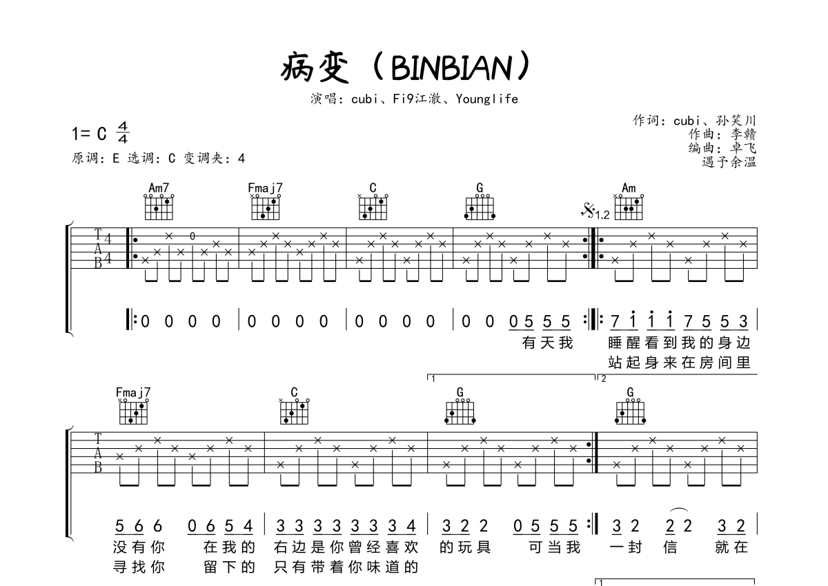 cubi/Fi9江澈/Younglife《BINGBIAN病变》吉他谱 - C调弹唱六线谱