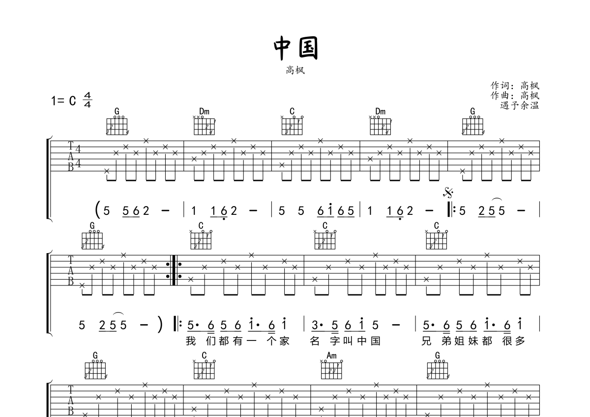 儿歌《中国》吉他谱 - C调弹唱六线谱