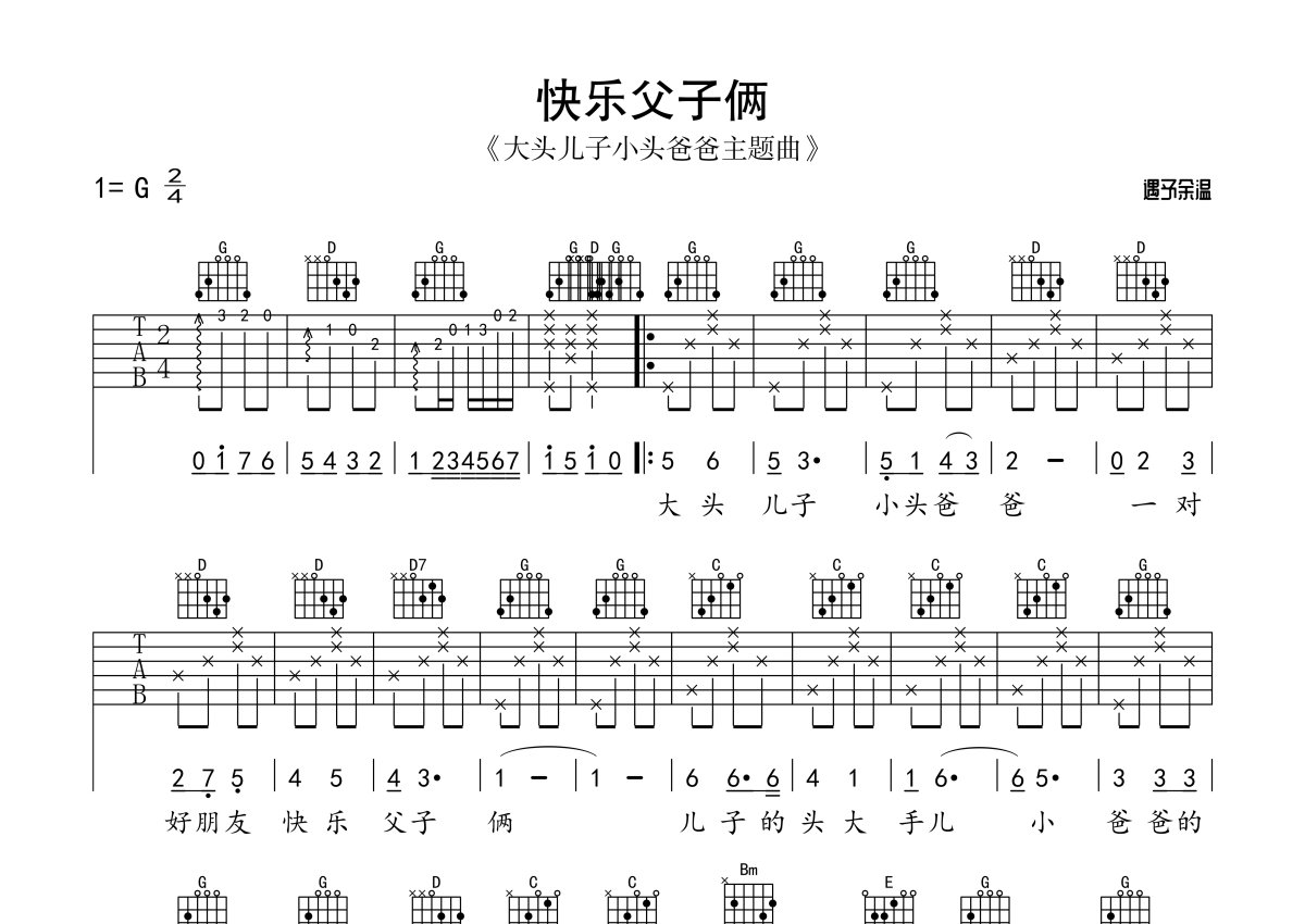 《快乐父子俩》,本吉他谱采用的是C调指法编配,这份吉他谱共有一张高清图谱,图谱由 @玉帝哥哥 编配上传,图谱使用六线谱编配,包含吉他和弦指法、简谱以及歌词部分,使用这份快乐父子俩吉他谱,可以让你更加方便地掌握这首歌曲的弹唱技巧,快来尝试吧。C调版 儿歌《快乐父子俩》吉他弹唱谱。