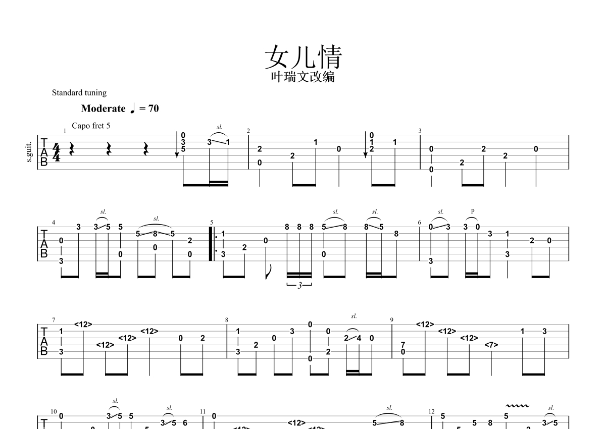 叶锐文《女儿情》吉他谱 - C调独奏六线谱