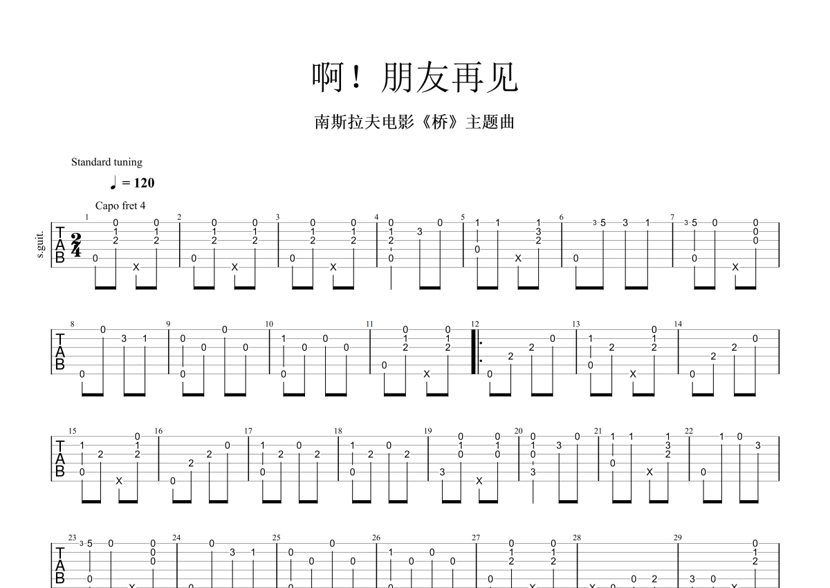 《啊朋友再见》是电影《桥》主题曲演唱的一首歌曲,本吉他谱采用的是C调指法编配,这份吉他谱共有一张高清图谱,图谱由 @玉帝哥哥 编配上传,图谱使用六线谱编配,曲谱配备了相关的音频提供试听,使用这份啊朋友再见吉他谱,可以让你更加方便地掌握这首歌曲的演奏技巧,快来尝试吧。电影《桥》主题曲《啊朋友再见》吉他谱_C调吉他独奏谱。