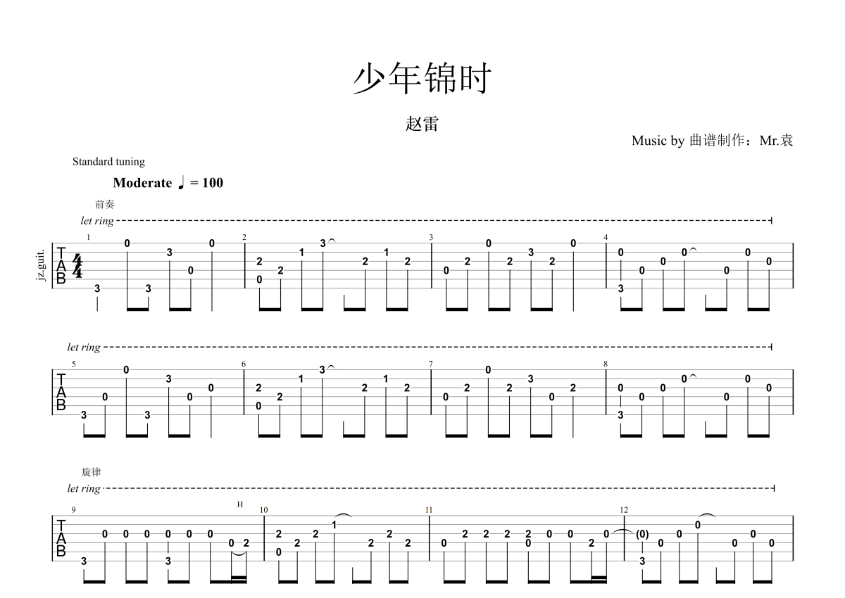 赵雷《少年锦时》吉他谱 - 独奏六线谱 - 中国好声音版本