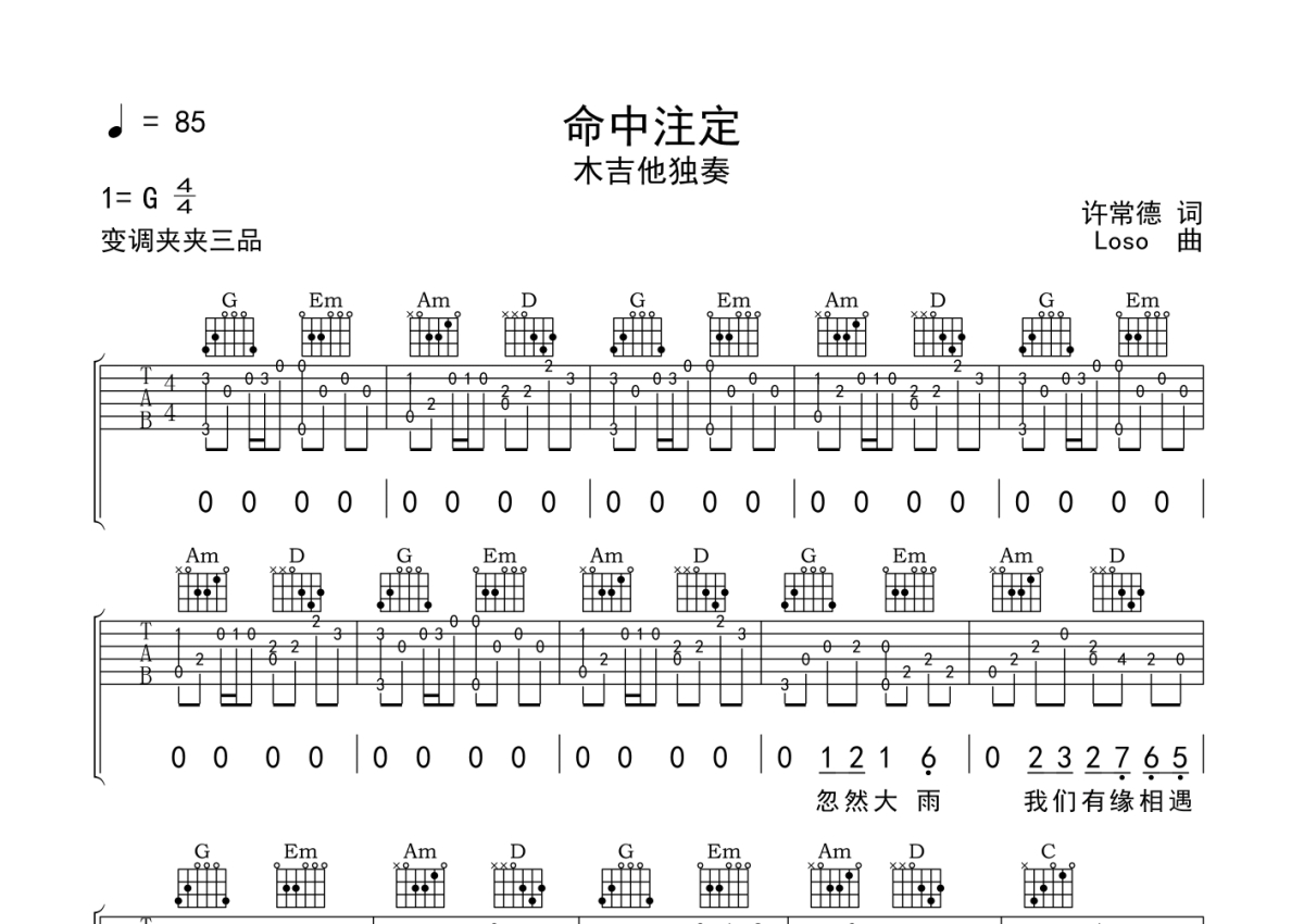《命中注定》是庾澄庆演唱的一首歌曲,本吉他谱采用的是C调指法编配,这份吉他谱共有两张高清图谱,图谱由 @玉帝哥哥 编配上传,图谱使用六线谱编配,使用这份命中注定吉他谱,可以让你更加方便地掌握这首歌曲的演奏技巧,快来尝试吧。庾澄庆《命中注定》吉他谱_C调吉他独奏谱。