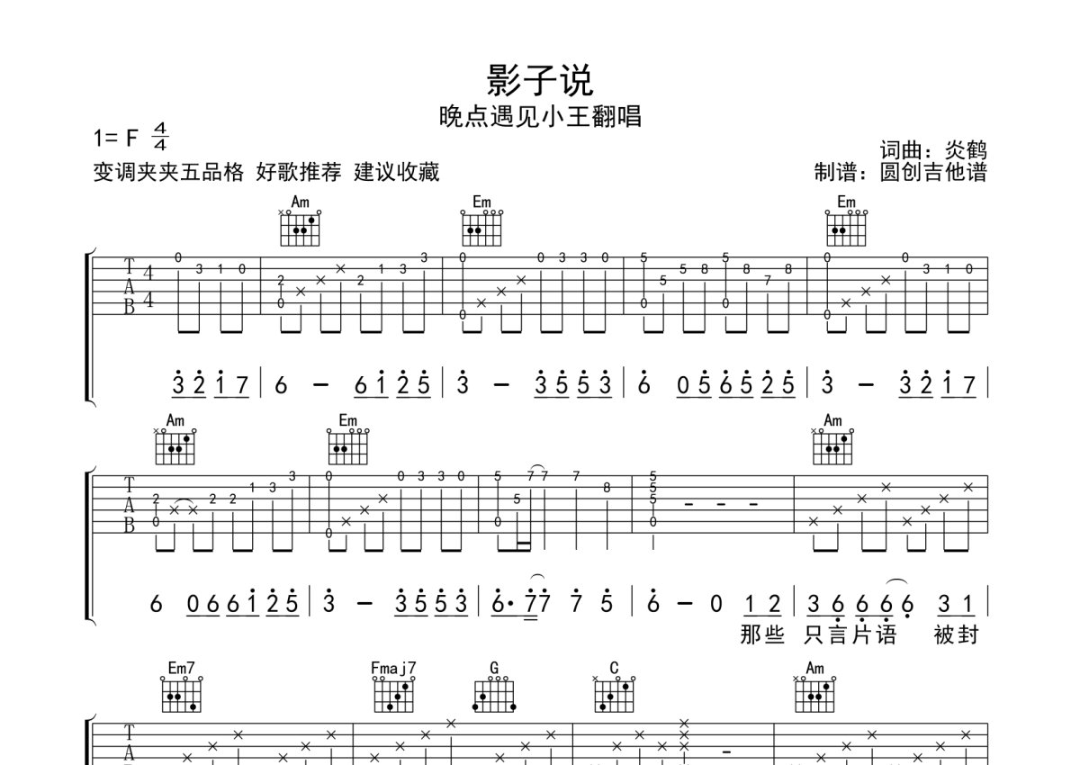《影子说》是晚点遇见小王翻唱演唱的一首歌曲,本吉他谱采用的是C调指法编配,这份吉他谱共有四张高清图谱,图谱由 @圆创吉他谱 编配上传,图谱使用六线谱编配,包含吉他和弦指法、简谱以及歌词部分,曲谱配备了相关的音频提供试听,使用这份影子说吉他谱,可以让你更加方便地掌握这首歌曲的弹唱技巧,快来尝试吧。