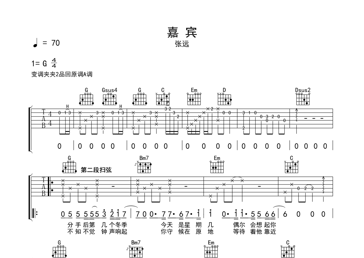 《嘉宾》是张远演唱的一首歌曲,本吉他谱采用的是G调指法编配,这份吉他谱共有三张高清图谱,图谱由 @玉帝哥哥 编配上传,图谱使用六线谱编配,包含吉他和弦指法、简谱以及歌词部分,使用这份嘉宾吉他谱,可以让你更加方便地掌握这首歌曲的弹唱技巧,快来尝试吧。嘉宾吉他谱,张远演唱的一首诠释爱情苦涩的伤感歌曲,嘉宾吉他六线谱,原调A选调G,CAPO夹二品。这首歌曲触动了每个人内心最柔软的部分,也许在每个人心里都有一个“嘉宾”,有一个遗憾错过的人,有一个只能笑着祝福的人,在这首歌曲播放的时候也就陷入那段过去的回忆。见证她爱情的嘉宾也是另一种宿命。谢谢你予我嘉宾,还我最后清醒。