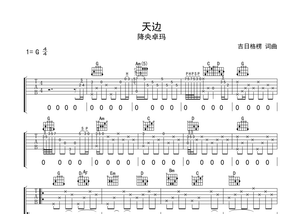 降央卓玛《天边》吉他谱 - G调弹唱六线谱